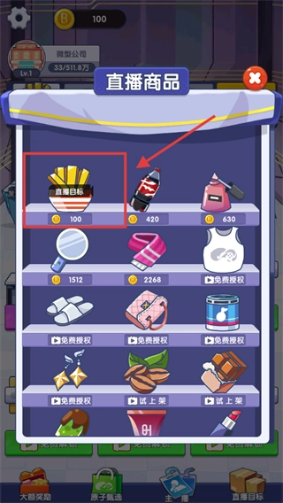 花费100金币选择直播目标商品进行直播,完成订单后可获取收益和进度。
