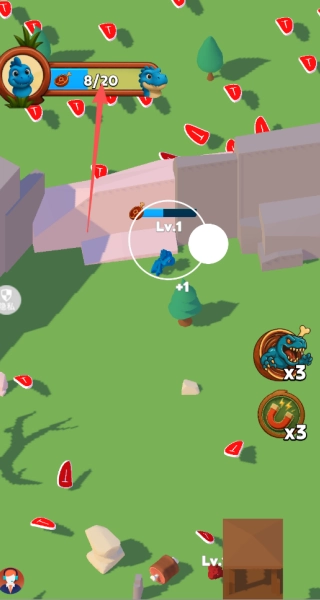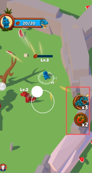 当等级达到Lv.2后,就可以合理运用右侧的技能道具了。比如使用恐龙攻击技能能够一次性打倒多个低等级恐龙,而磁铁技能则可以大范围地收集肉块。
