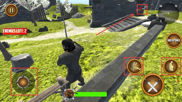 进入游戏后,你可以通过左下角的虚拟摇杆来操控角色移动,右侧的按键则能实现下蹲和跨越障碍的动作。接下来就朝着敌人的方向前进,准备好迎接战斗吧!