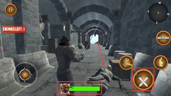 接近敌人后,点击右侧的攻击按钮释放技能,与敌人展开激烈的近身拼杀,记得要及时躲避对方的攻击哦。