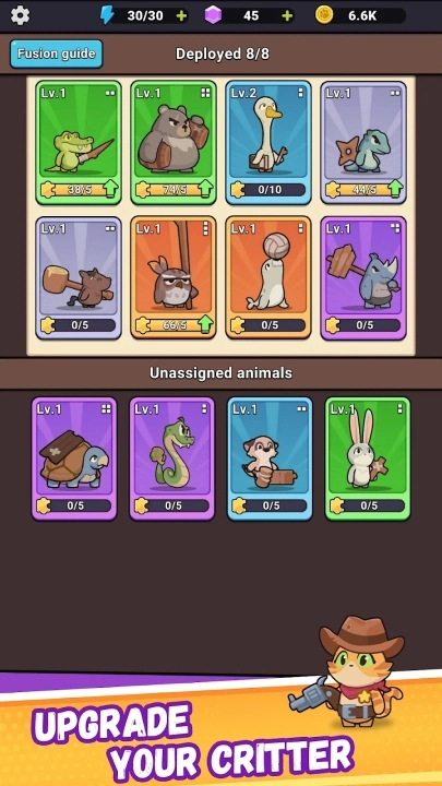 玩家需要收集各类动物,通过建造与升级它们来解锁特殊技能,同时还要设计军队阵型并规划攻击策略。战斗胜利后可获取金币,这些金币能用于强化军队,助力玩家赢得首领战与挑战模式。2、玩家可以提升小动物的各项属性以增强整体实力,挑选心仪的宠物组建强力阵容,凭借策略战术的运用来击败对手。