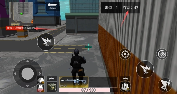 3、要时刻留意当前剩余的敌人数量以及安全区的缩圈动态,保证自己一直处在安全区域当中。