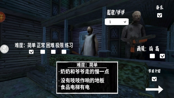 2、可从简单、正常、极限、练习这四种难度里任选一种,不同难度下奶奶的移动速度会有所不同。