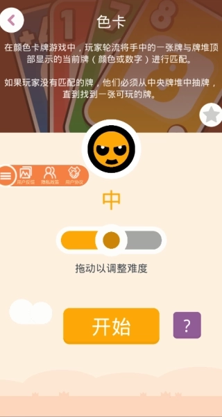 1、颜色卡牌游戏的玩法是轮流出牌,玩家要把手牌和牌堆顶部的明牌在颜色或数字上进行匹配,要是没法匹配就得抽新牌,第一个出完手牌的人获胜。