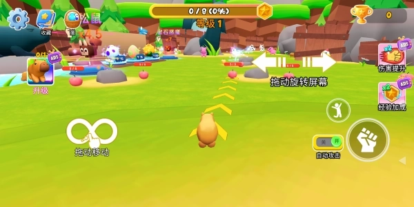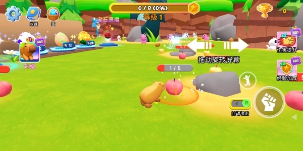 2.用左手操控水豚的移动,点击右侧能开启自动攻击功能,当水豚接近目标时,就会对目标发起自动攻击。