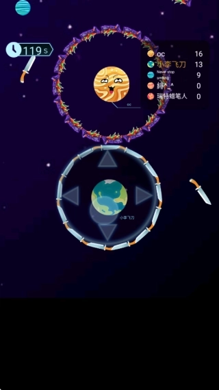2.玩家操控星球在竞技场内移动,通过收集散落的飞刀强化自身属性,逐步提升攻击半径与生存能力。