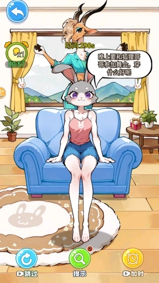 1、游戏启动后进入关卡界面,依据当前主题任务的具体要求,确定兔子需要的穿搭风格以及与场景相适配的方向。