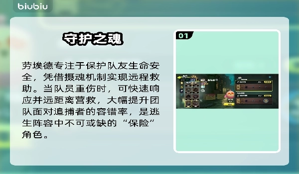 1、在逃生阵营里担任战略辅助的管家,依靠“灵魂链接”这一技能具备双重作用:既能对追击者造成眩晕效果,也能远程救助队友,该技能的有效作用范围为10米。