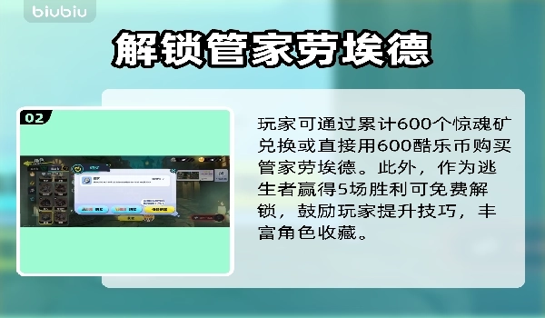 3、获取方式:可通过消耗600惊魂矿兑换、使用600酷乐币直接购买,或是完成5场逃生胜利免费解锁该角色,帮助玩家丰富角色收藏库。