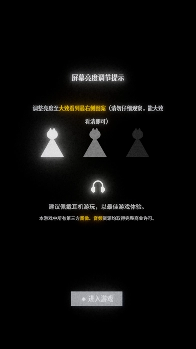 1、打开游戏界面后,按照屏幕上显示的文字操作:屏幕亮度调节提示:将亮度调整到大致能看到最右侧图案的程度(无需仔细观察,大致看清即可)。建议佩戴耳机游玩,以获得最佳游戏体验。
