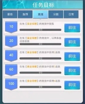 【竞技】:需在设有目标鱼的竞技赛事中取得胜利,最高标准是达成4连胜。
