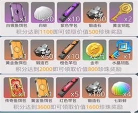 完成每日试炼任务后,我们能得到不同数量的试炼积分。当积分满足进度要求时,就可以领取相应的阶段奖励,这些奖励包括大量饵料包、紫色竿包、橙色竿包、红色竿包以及七彩蚌等贵重物品。