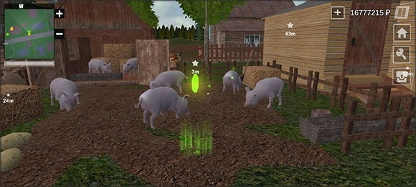 在俄罗斯乡村模拟器3D中与乡村动物进行互动。