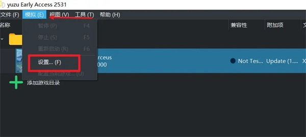先开启yuzu模拟器,接着加载游戏。随后点击左上角菜单里的“模拟选项”,在弹出的菜单中挑选“设置”。