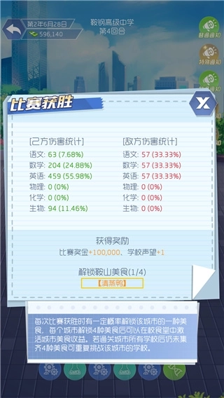 6、赢得比赛后,可获得1000000比赛奖金、1点学校声望,并且能够解锁鞍山特色美食“清蒸鸭”。