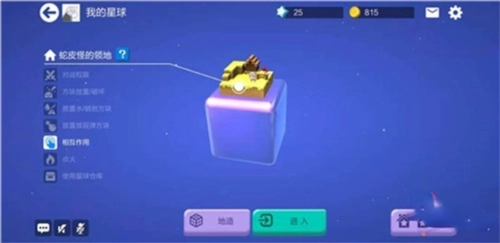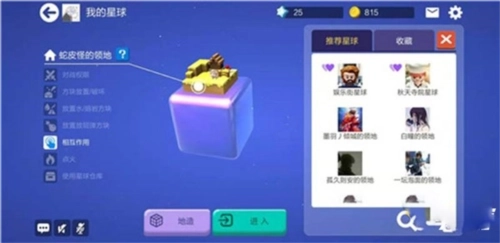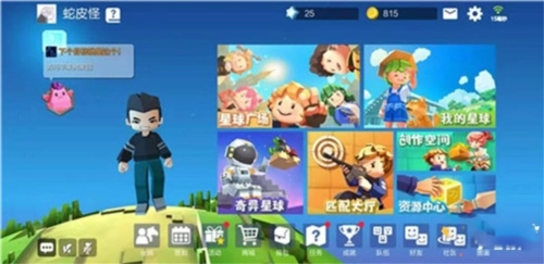 1、首先我们通过大厅右上方的【我的星球】,进入自己的专属星球,在自己的星球上,我们不仅可以进行冒险探索、种菜养养小动物,而且还可以采集各种资源,打造不同的武器装备等等。
