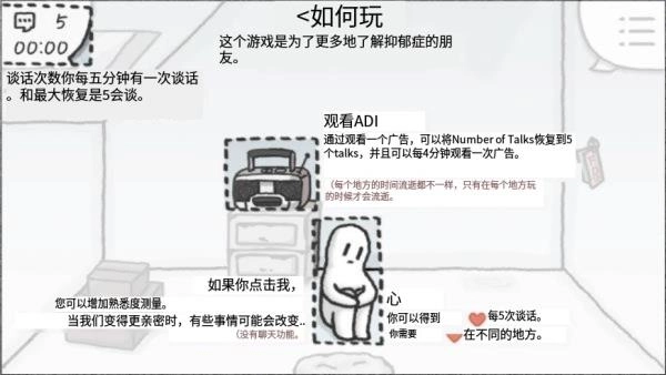 2、这款游戏旨在让大家更深入地了解患有抑郁症的朋友。在游戏过程中,每五分钟你就能获得一次与他对话的机会,通过交流可以提升彼此的熟悉度。当你们的关系变得更亲密时,一些情况也会随之发生改变。