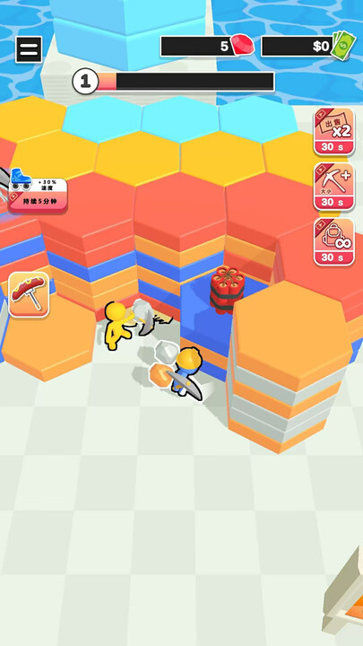 2、操控两个小人,使用镐子进行挖矿操作。同时,留意上方显示的资源数量,根据实际需求点击旁边的功能图标。