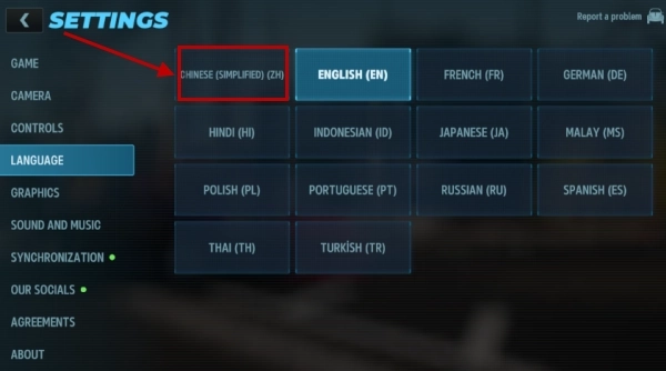 3、在语言列表中,选择排在首位的“简体中文”,确认后游戏界面将立即切换为中文显示。
