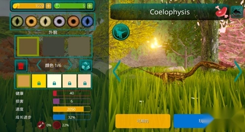 3、游戏拥有自定义装扮系统,玩家可捏造专属的恐龙形象,在左侧编辑各种外貌和颜色。
